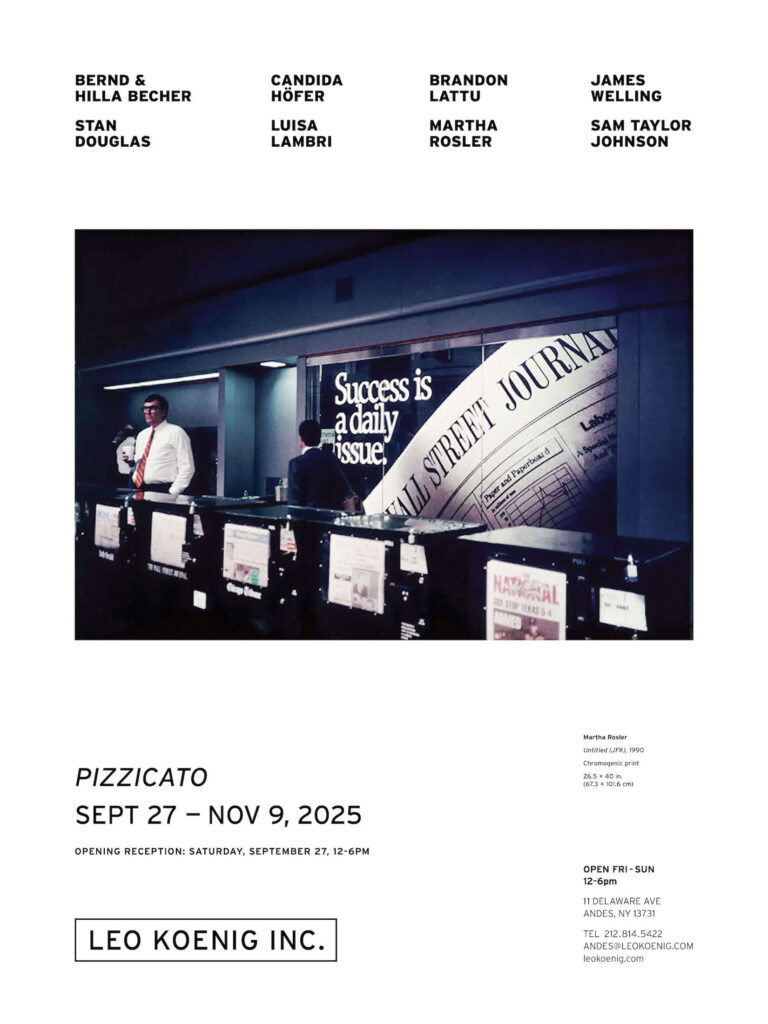 Leo Koenig Inc, Andes is delighted to present Pizzicato, a group exhibition featuring works by Bernd and Hilla Becher, Stan Douglas, Candida Höfer, Sam Taylor-Johnson, Luisa Lambri, Brandon Lattu, Martha Rosler, and James Welling.